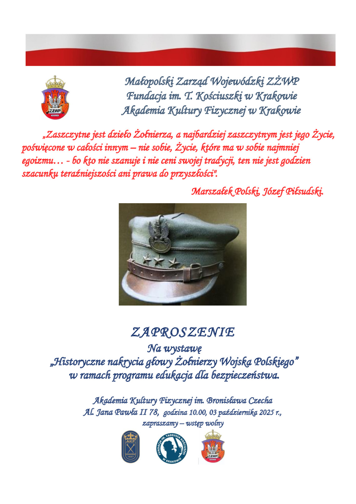 Podczas Inauguracji Roku Akademickiego 2025/2026 zostanie zaprezentowana wystawa w holu głównym pt. „Historyczne nakrycia głowy Żołnierzy Wojska Polskiego” .